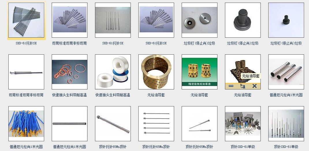 主要产品有塑胶模、五金模、塑胶模具标准件、非标镶件、SKD61异型顶针。 五金模具标准件滑动导柱、滚珠导柱、独立导柱、SKD11、SKH51异形冲针。压铸模具标准件以及各种模具配套压板螺丝等。
